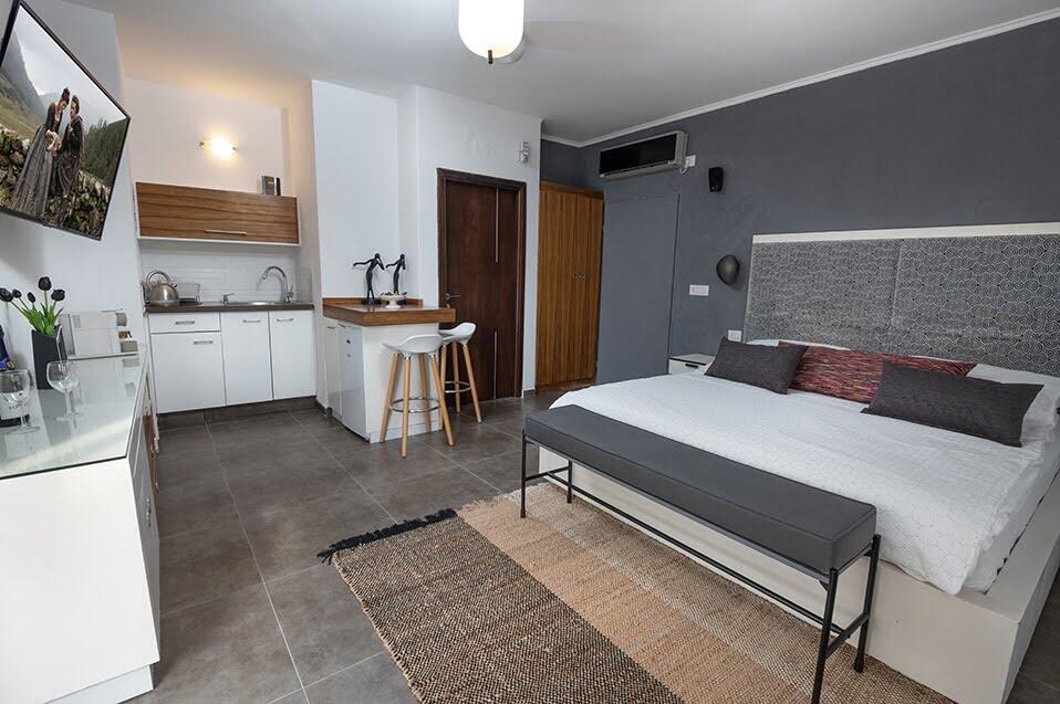 בסוויטה המפנקת תמצאו מיטה זוגית יוקרתית מוצעת במצעים איכותיים ורכים, מסך LCD הכולל חיבור לערוצי הלוויין, סלון הנפתח למיטה בעת הצורך, חדר אמבטיה מפואר ואיכותי, פינת מטבחון הכוללת בר מעוצב, מכונת אספרסו איכותית, מקרר, מיקרוגל, קומקום, פינת קפה וכלי מטבח. כל הסוויטות ממוזגות היטב וכוללות WIFI חופשי להנאתכם.