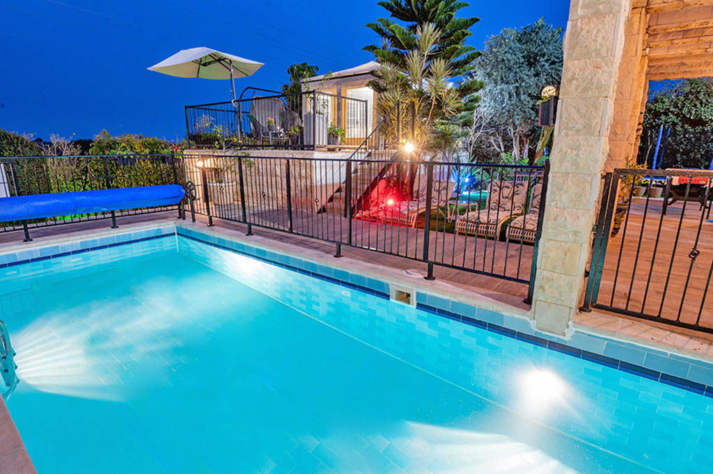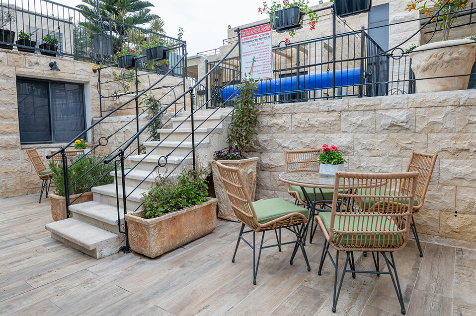 מחוץ לסוויטות תגלו חצר מטופחת ונעימה, המאפשרת ליהנות מהשקט והשלווה ולצפות בשקיעות משגעות. במרכז החצר בריכה צלולה, המחוממת בימי החורף. סביב הבריכה מיטות שיזוף, פינות ישיבה וגם שולחן אוכל משפחתי.